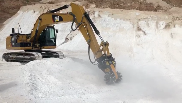 Ci spostiamo ora in Messico, in una cava di gesso. Al posto degli esplosivi, costosi e poco precisi, un’azienda ha utilizzato le frese MB Crusher per ridurre il materiale in piccole pietre di pochi millimetri, evitando di creare grandi quantità di polvere.